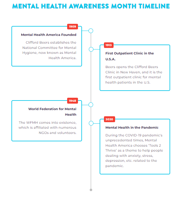 Mental Health Awareness Month was first celebrated in the year 1949. It was commemorated by the Mental Health America organization, which was then known as the National Committee for Mental Hygiene and then later as the National Mental Health Association before it got its current name. The association was founded by Clifford Whittingham Beers, who was born in 1876 in Connecticut as one of five children in his family who all suffered from mental illness and psychological distress. All of them also went on to spend time at mental institutions and it was from his hospital admittance that he discovered that the mental health field had a notorious reputation for malpractice, maltreatment, and immense bias.